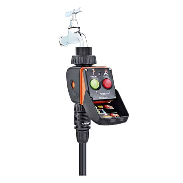 Premendo il “verde” si avvia il programma: quando l’irrigazione è giudicata sufficiente, si preme il “rosso”. Pratico memorizza il tempo intercorso fra le due operazioni e ripete il programma, della durata massima di 60 minuti, tutti i giorni alla stessa ora